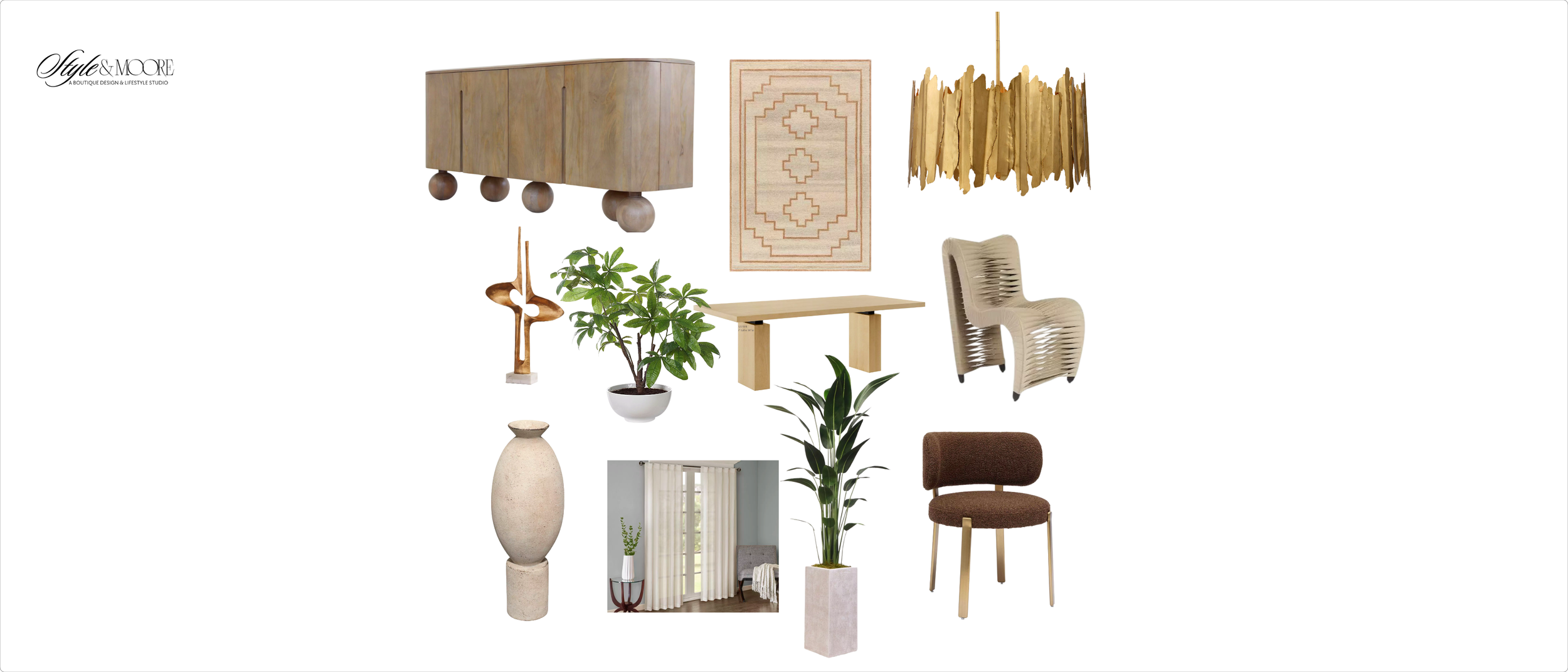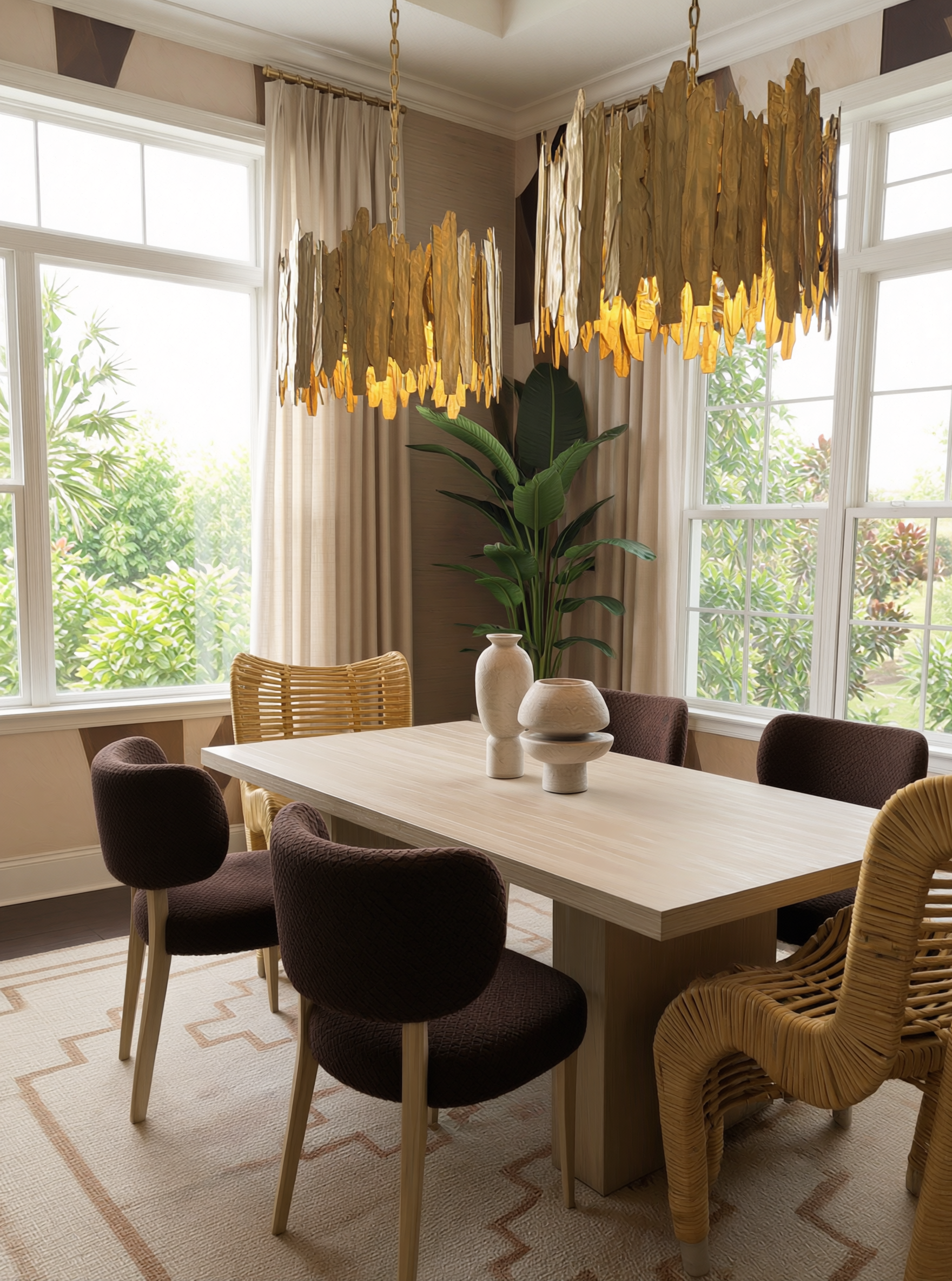 Dining Room A geometric abstract mural in cocoa and cream, rattan host chairs, chocolate boucle side chairs, and double linear gold chandeliers that feels architectural. The Golden Ratio is the room where warmth and precision are in perfect proportion.