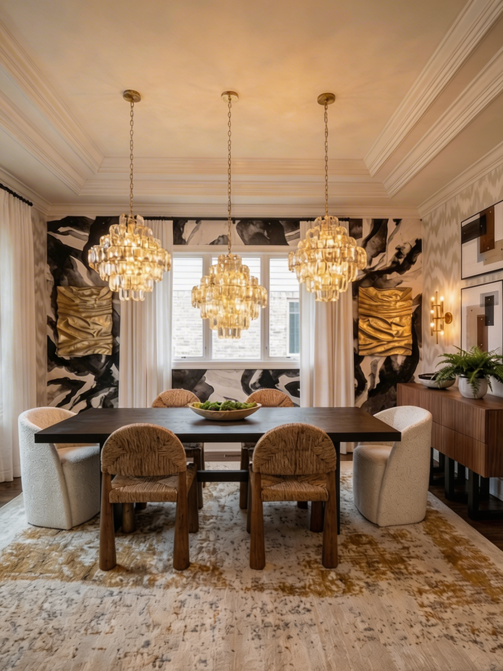 Dining Room Black and white abstract murals, triple amber cluster chandeliers, and a mix of chairs that should not work together but absolutely do. Ink & Opulence is for the dinner table where the conversation is as bold as the your outfit.