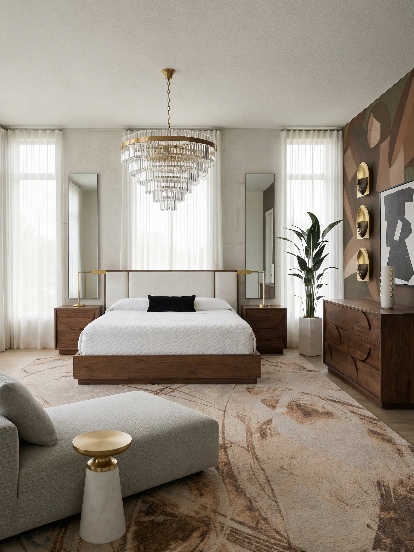 Bedroom Terracotta waves, a golden chandelier, a layered vintage rug, and mid-century warmth that feels well-traveled and fully lived in. Terra Nova is for the room that tells a story, one where every piece has a past and a purpose.